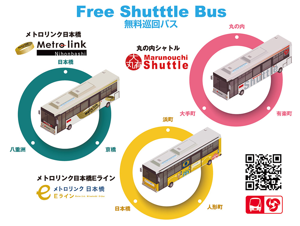 「東京建築祭」の開催エリアで、無料巡回バスが走っています。大手町・有楽町・丸の内で「丸の内シャトル」、日本橋・京橋で「メトロリンク日本橋」「メトロリンク日本橋Eライン」の3系統。当日の建築めぐりにご利用ください。