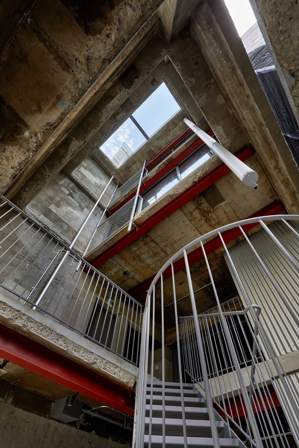 大胆な「減築」を、1969年築の不適合建築に施した「岡田ビル」。床面積を減築させることで適法化と同時に採光や通風をもたらし、まちの骨格を更新する建築として生まれ変わりました。その社会性とデザイン性の高さから、2023年度グッドデザイン・ベスト100を受賞しています。今回は屋上まで続く階段と屋上を特別公開。神田錦町に本社を置き、まちづくりを担う、安田不動産ならではの独創的で豊かな建築空間を体験してください。